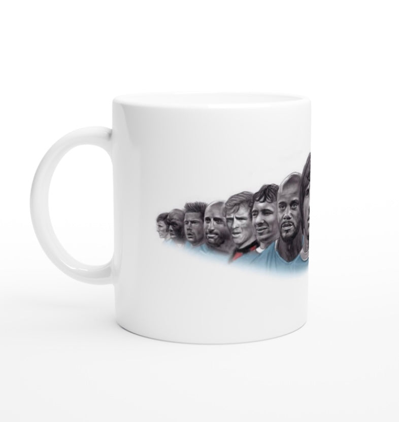 My drawing of Kevin De Bruyne, with some of Man City’s greatest players from the past behind him in the background printed on to an 11oz ceramic mug.