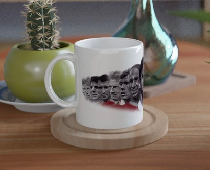 My drawing of 15 Man Utd legends printed on to a mug from L to R : Beckham, Schmeichel, Edward’s, Keane, Law, Scholes, Charlton, Cantona, Best, Giggs, Robson, Rooney, Solskjaer, Hughes, Ronaldo